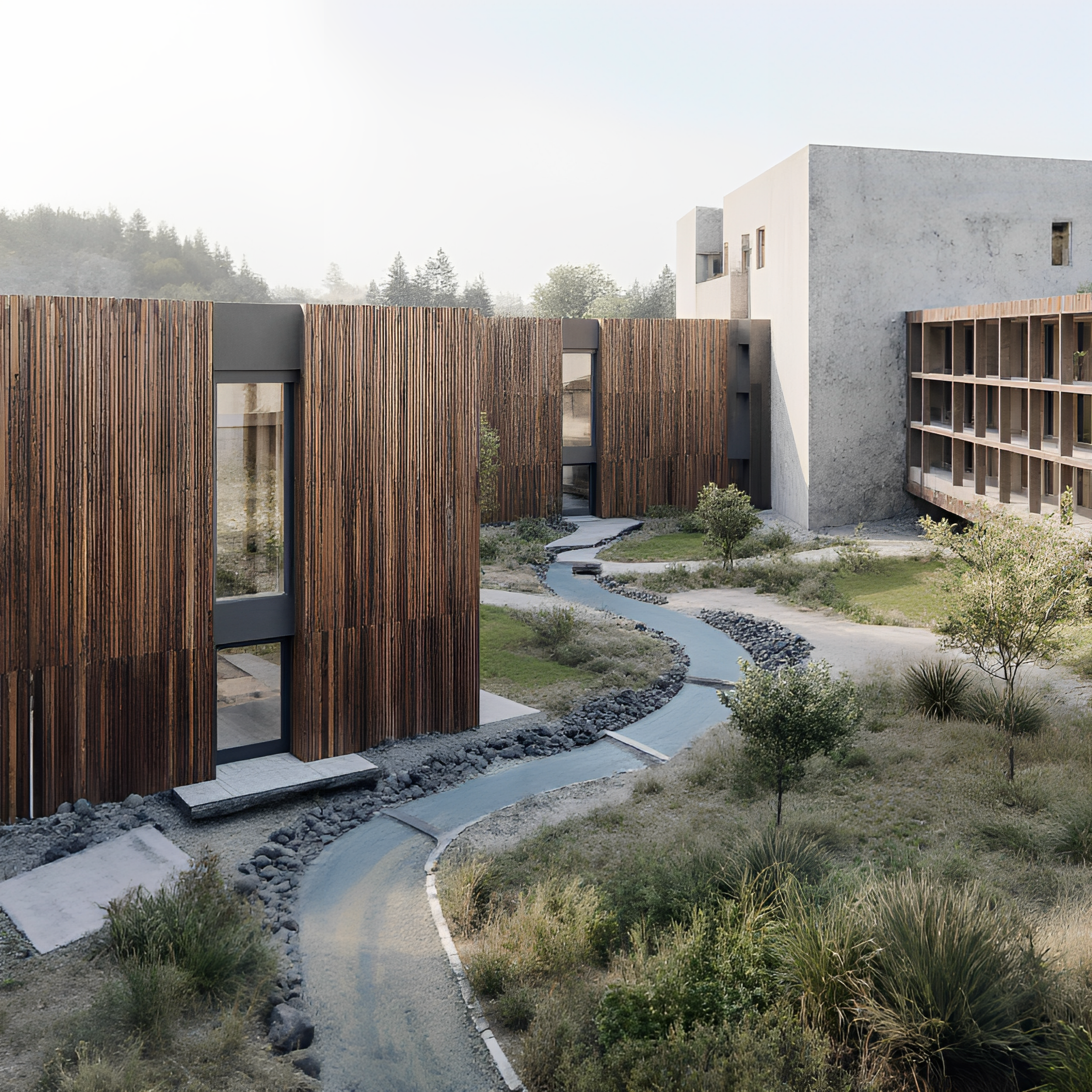 A nature-anchored campus where architecture lifts lightly above the landscape, creating serene spaces that dissolve the boundary between built form and the living environment.