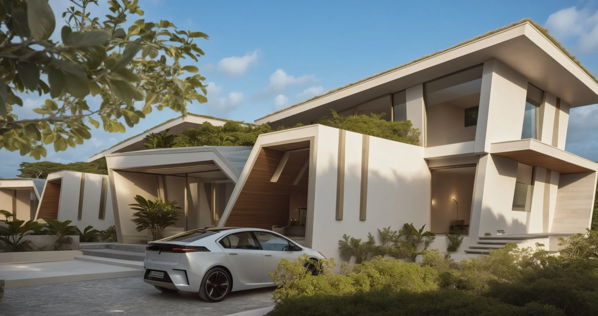 A contemporary villa that blends sculptural geometry with lush landscaping, creating a seamless transition between indoor comfort and the surrounding tropical garden, designed in a way that is easy to replicate for an upscale planned community.