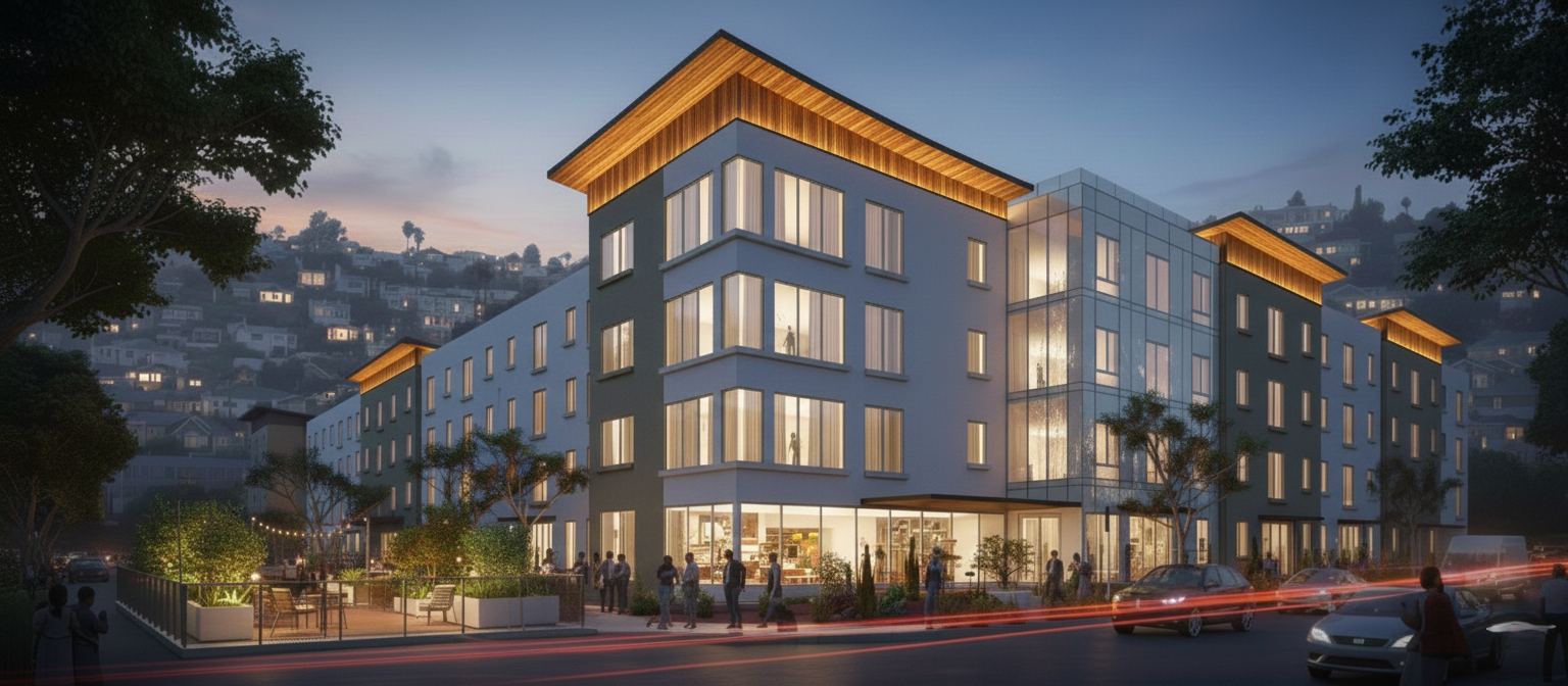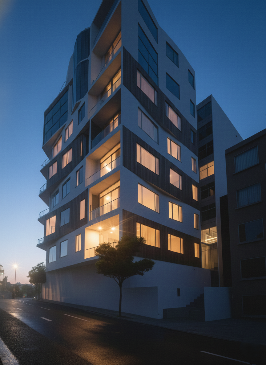 A contemporary mid-rise residential building brought to life with warm lighting, clean forms, and an active streetscape that creates a welcoming presence in the evening skyline.