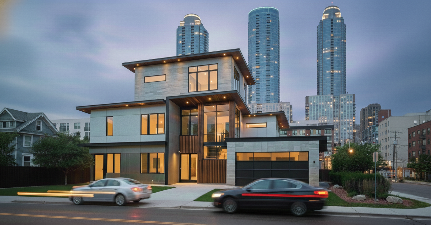 A striking three-story modern home that pairs warm materials and expansive glazing with views of the surrounding urban skyline.