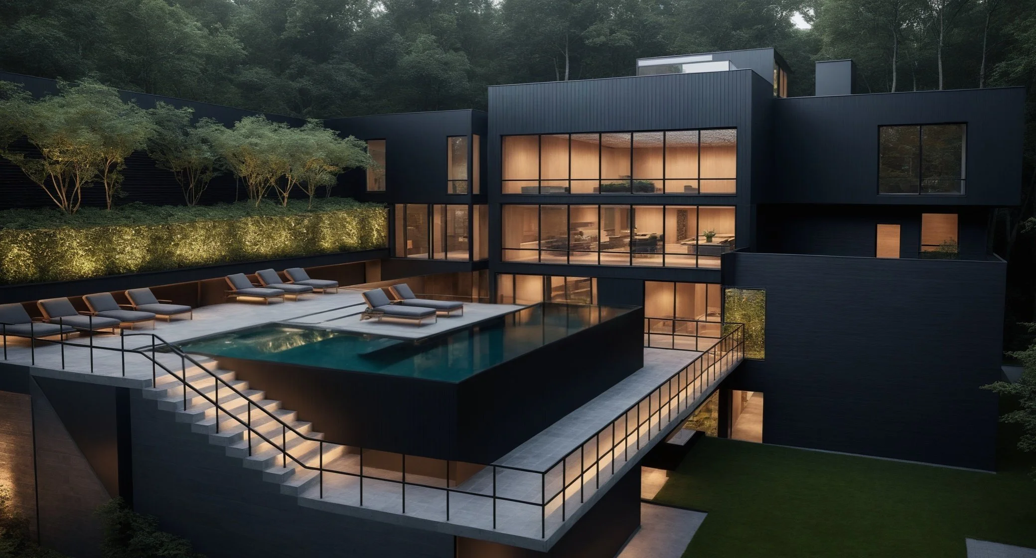 A sleek, modern residence framed by Portland’s forested landscape, with warm interior lighting and a serene pool terrace that creates a luxurious retreat.