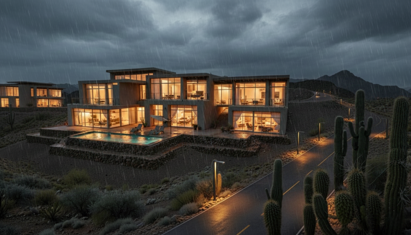 A dramatic desert residence with an upside-down floor plan, glowing against the Arizona landscape with expansive glazing and a terraced pool deck.