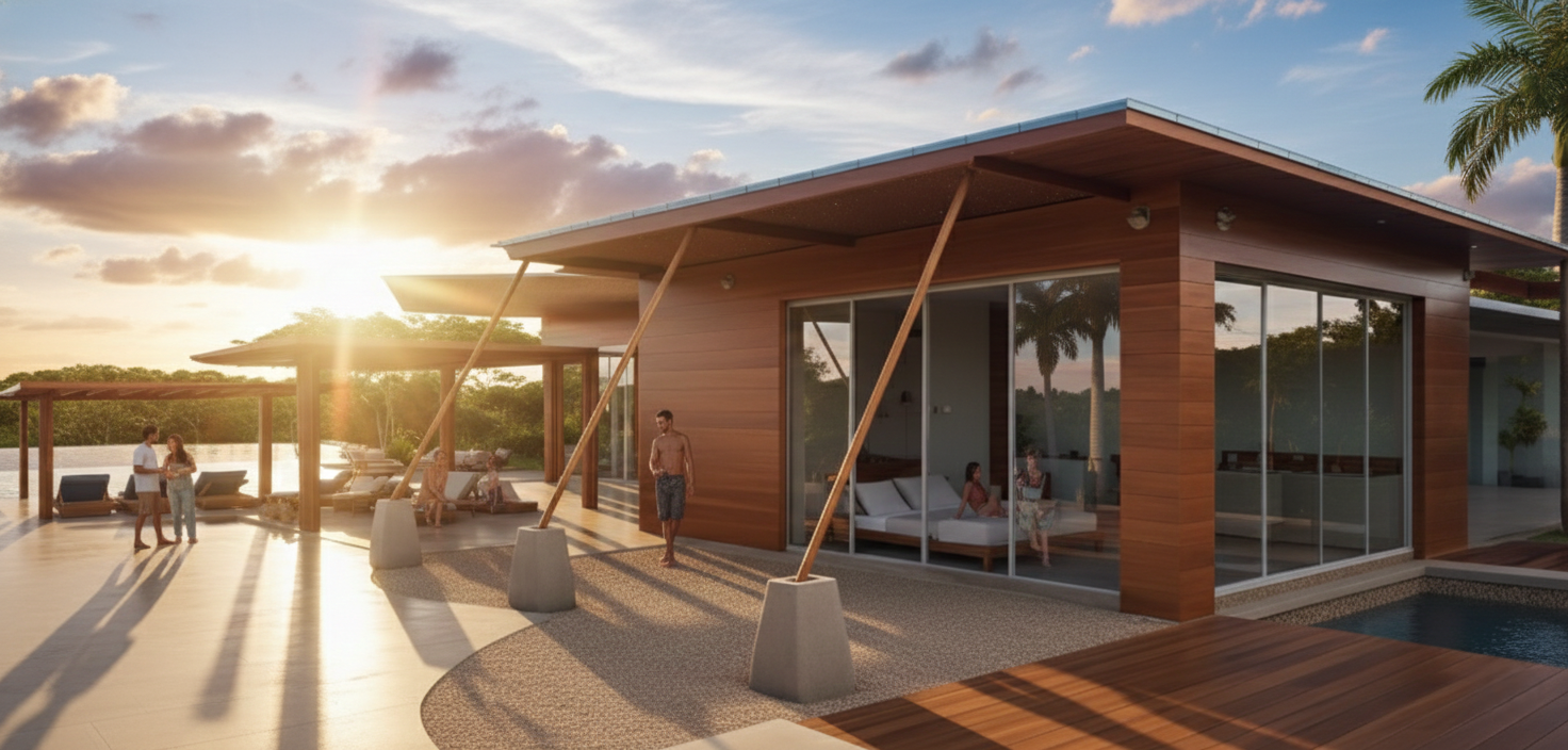 A serene vacation pavilion that blends warm wood, open-air living, and soft desert light to create an inviting retreat.